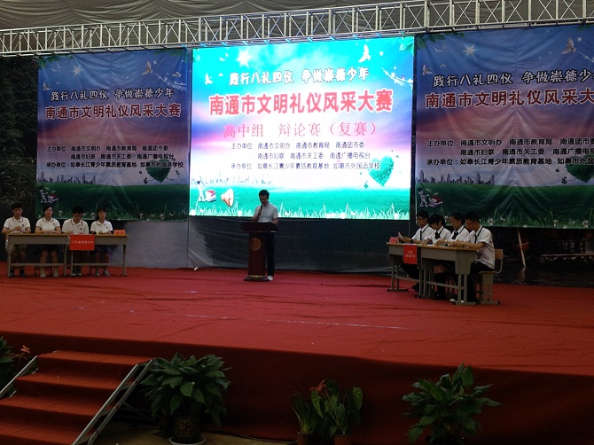 为了深化中国特色社会主义和中国梦宣传教育,培育和践行社会主义核心价值观,引导广大学生崇德向善、崇尚文明,学礼仪、知礼仪、行礼仪,今年五月至七月,南通市文明办、南通市教育局、共青团南通市委、南通市妇联、南通市关工委、南通市少工委、南通广播电视台联合举办了“南通市未成年人文明礼仪风采大赛”,这次比赛形式有:知识竞答、辩论赛、微视频展示。我校代表通州区参加了高中组的比赛,政教处选拔了由张斌禄、邢艺、瞿子钰、秦李波、宗溢男五位同学组成的参赛队,请张剑平、徐孝涛、钱小华、张炜、王冰心等老师组成辩论赛的教练团,请张伟、张炜、刘永新等老师组成微视频创作团队。