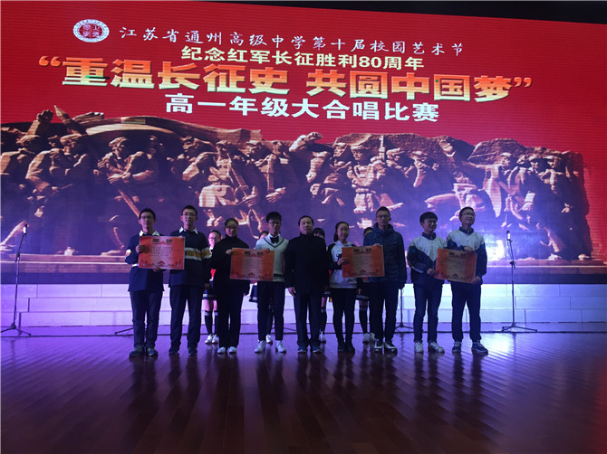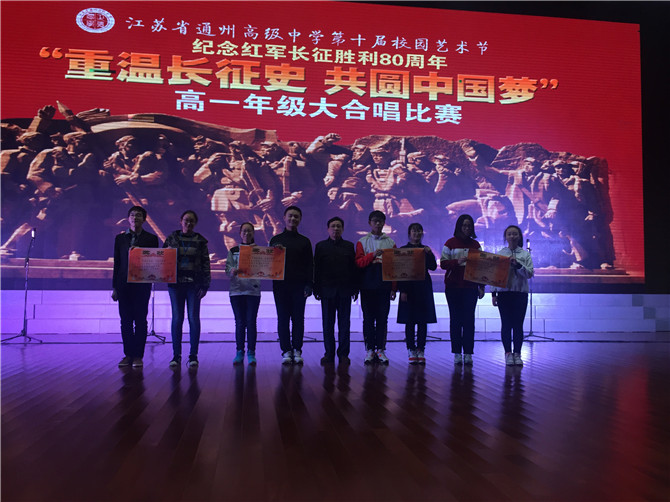 本次比赛是为了弘扬长征精神,激发青年学生的爱国热情,以实际行动学习贯彻党的十八大精神,展示通高学子的青春风采,提升巩固我校艺术教育教学成果,学校高度重视,精心策划,邀请到了通州中专音乐老师颜中梁老师,育才中学顾培培老师,同我校教务处主任高一年级主任赵建华以及音乐组老师朱灿、任晓洪、邱天涵一起担任比赛的专业评委,每个参赛组合中的一名班主任代表组成10人大众评委,张圣兵校长,管维新主任,张炜主任也到场参加了比赛活动。
