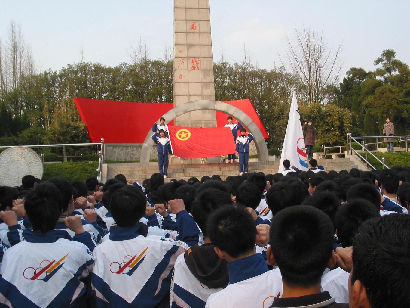 4月1日,我校政教处和团委会组织了“祭拜革命先烈,重温入团誓词”活动。下午3点30分,高一年级全体学生身着校服,高举校旗、团旗,排着整齐的队伍步行来到通州市烈士陵园。