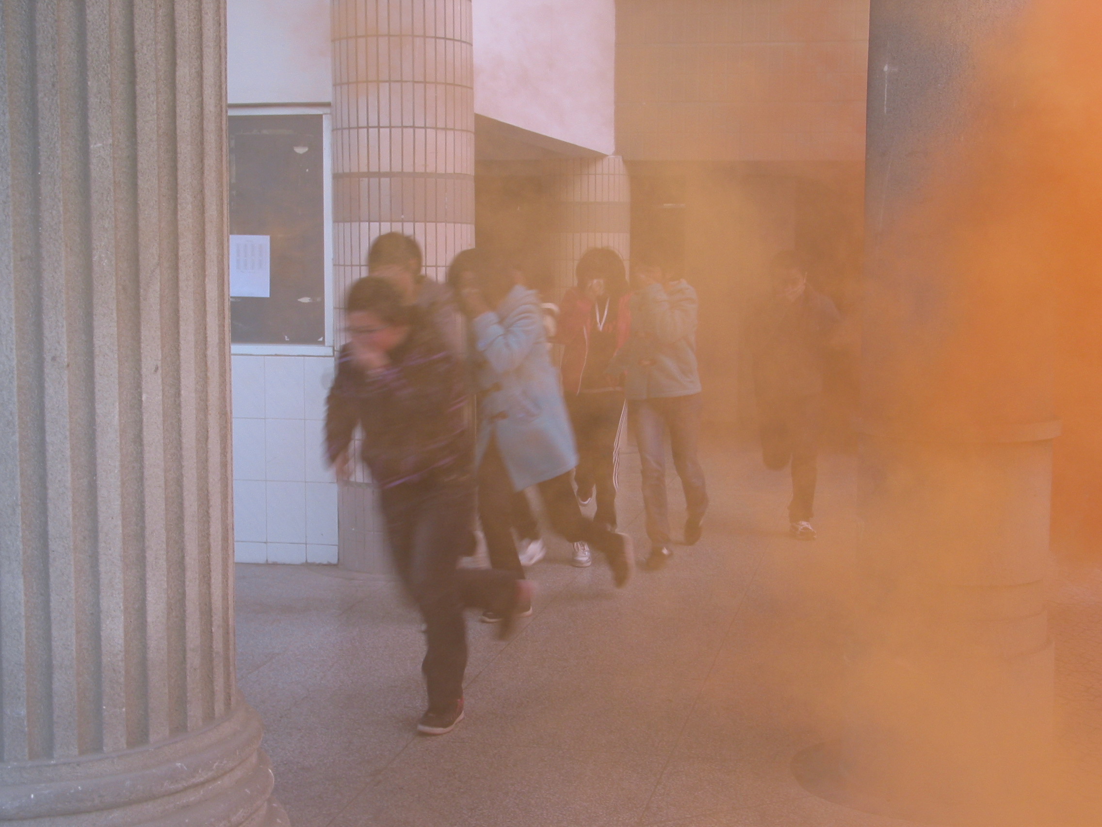 当日下午5时许,伴随着刺耳的警报,之远楼内冒出橙色的烟雾,正在上课的1000多名学生在老师和城北派出所民警的引导下迅速从楼内逃出,整个过程仅用了3分46秒。随后,通州区消防中队的宣传人员对全体参加演练的师生进行了一次消防安全知识培训,并讲解和示范了干粉灭火器的使用方法,最后,部分师生代表参加了干火灭火器灭油盆火演练。