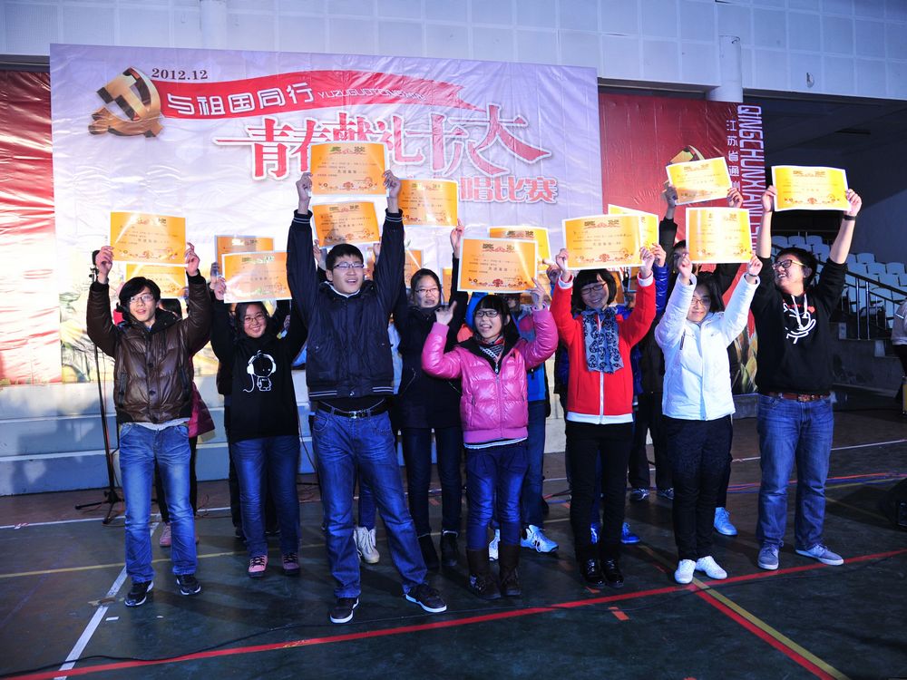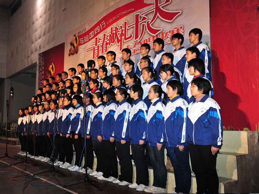 比赛开始后,一首首经典的歌曲,唱出了同学们的风采,他们用饱满的热情向十八大献礼。《国家》《精忠报国》《红旗飘飘》《爱我中华》唱出了他们对祖国深沉的爱;《明天会更好》《我相信》《最美的太阳》《跑出一片天》道出了他们对美好未来的坚定信念;《相亲相爱》《爱因为在心中》《和你一样》则诉说着他们纯洁的友情蓬勃的青春。比赛现场气氛热烈,同学们热血沸腾,完全把冬夜的寒凉挡在了体育馆的大门外。