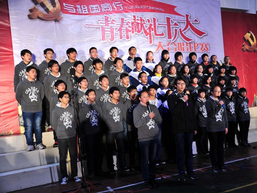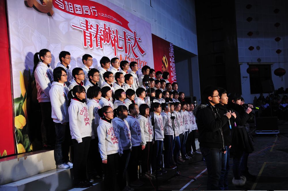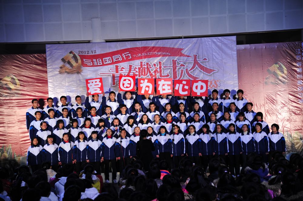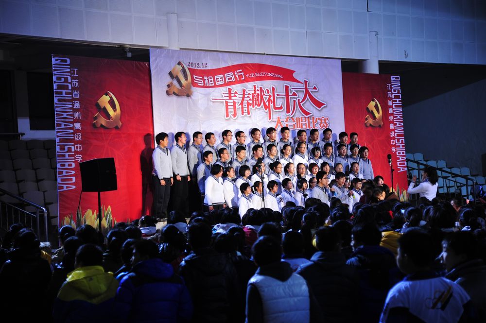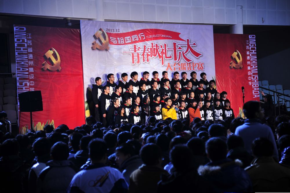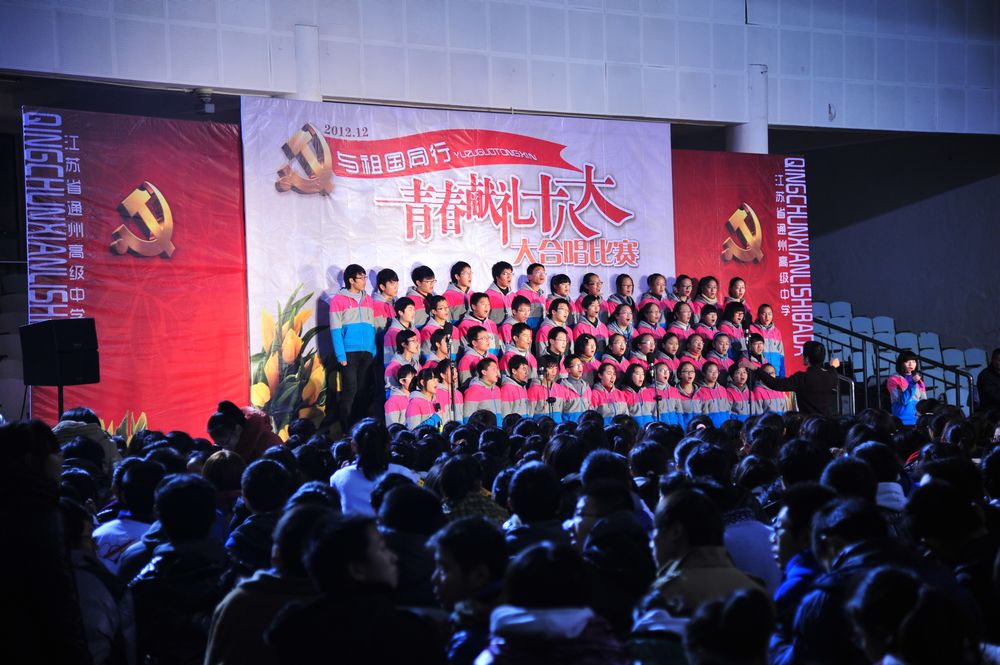 为庆祝党的十八大胜利召开和纪念一二九学生运动七十七周年,12月21日晚,通州高级中学举办了主题合唱比赛,表达同学们对祖国未来的憧憬与期望。