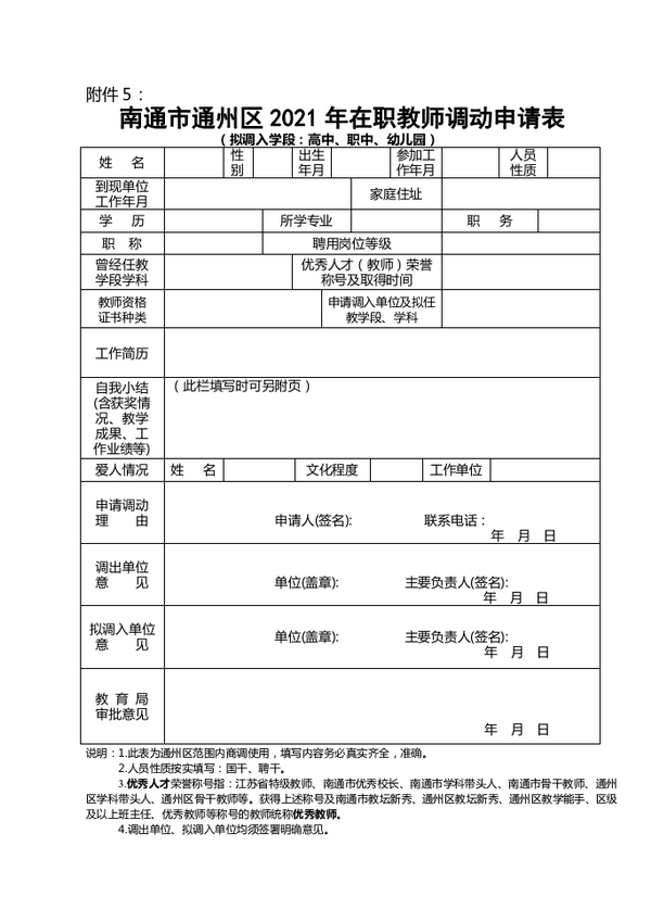 (1)教师个人提出申请。有调动意愿的老师,由本人填写《南通市通州区2021年在职教师调动申请表》,向所在学校提出书面申请,并在申请中注明调入通州高中的相关信息。
