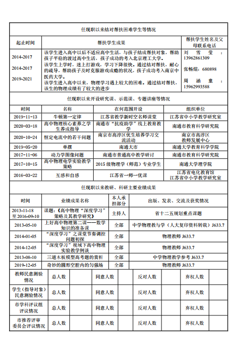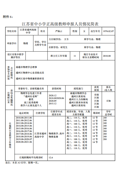 严灿云老师拟申报正高级教师申报表公示