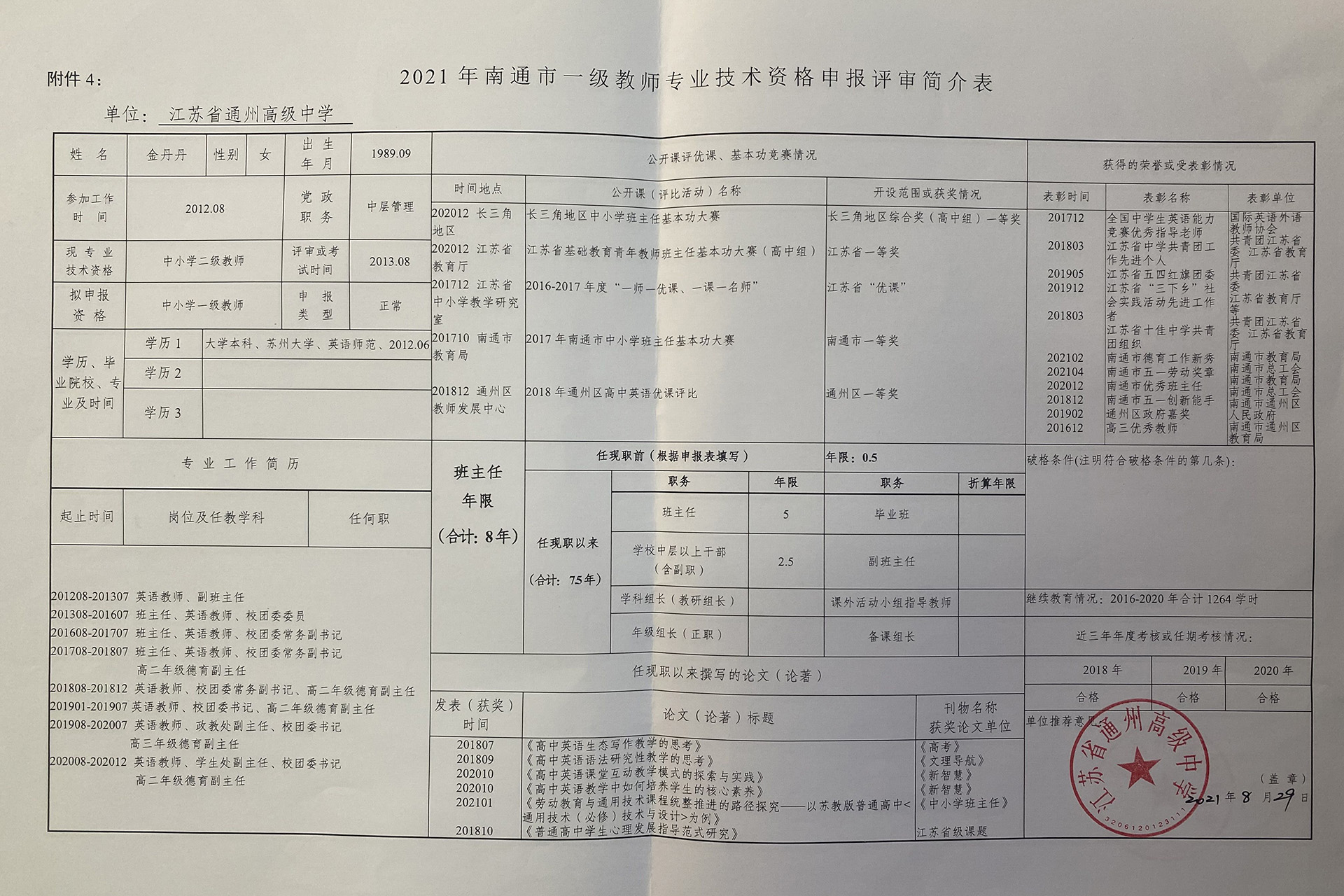 金丹丹拟申报一级教师简介表公示