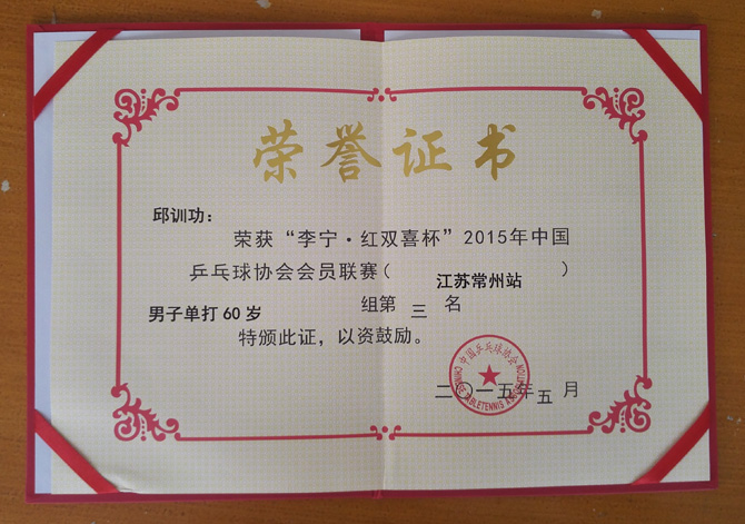 我校退休教师邱训功荣获“李宁.红双喜杯”比赛荣誉 时间:2015-06-01 浏览:次 分享到: 我校退休教师邱训功荣获“李宁.红双喜杯”2015年中国乒乓球协会会员联赛(江苏常州站)男子单打60岁组第三名。 打印正文 关闭本页 扫一扫关注通州高级中学