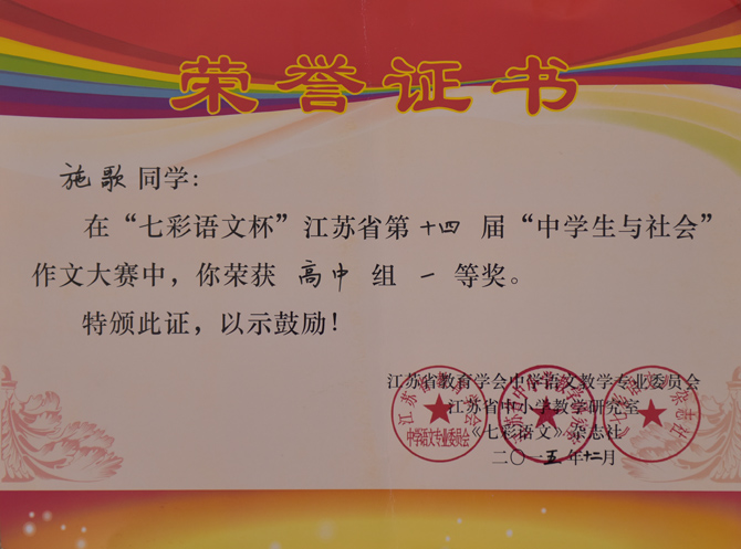 据了解,“七彩语文杯”江苏省“中学生与社会”作文大赛,由江苏省教育学会中学语文教学专业委员会、江苏省中小学教学研究室与《七彩语文》杂志社联合举办。大赛全部采用现场作文的形式,评比方式及奖项设置严谨,获奖人数控制严格,是目前为止江苏省内最具专业性和权威性,最能代表中学生写作水平、最受江苏省教育厅认可的高中阶段作文赛事,在全省中学语文教学界有着广泛影响,极具风向标意义。