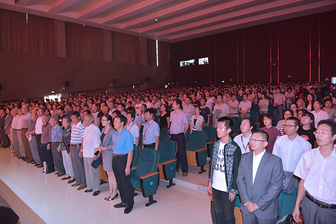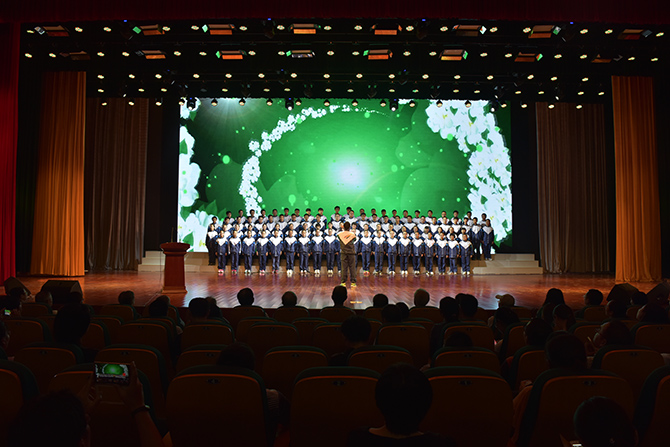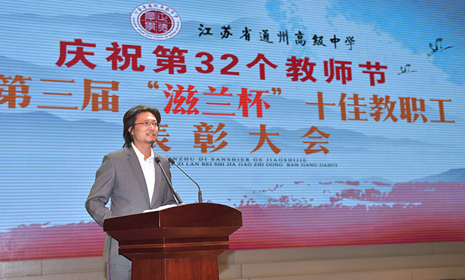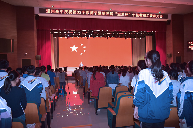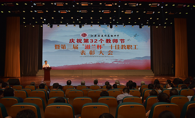 季仲平校长的教师节致辞将本次活动引向一个新的高潮。在贺辞里,季校长勉励全体师生员工不忘初心,共同开创通州高中新的辉煌!在学生合唱团嘹亮整齐的《通州高级中学校歌》 里,颁奖活动圆满结束。整个活动温馨而温暖,通高人的豪情在师生胸中激荡!