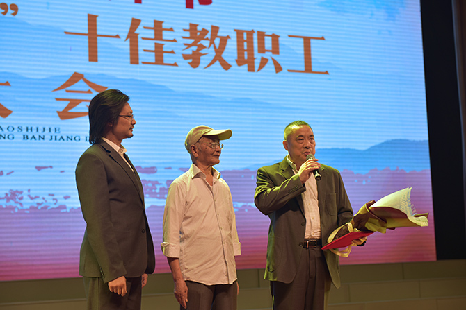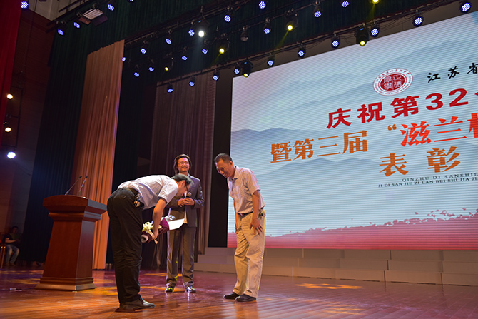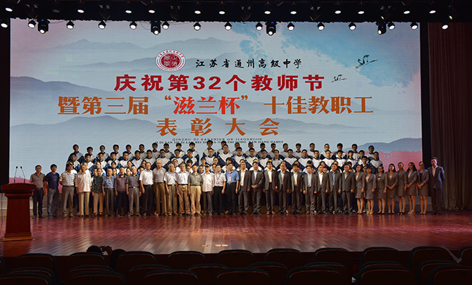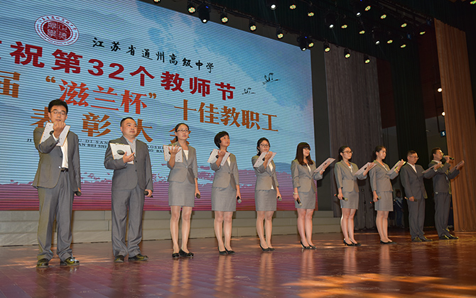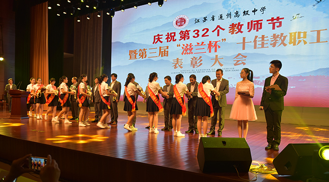 活动由一派艺术范的美术老师张伟主持,在全场雄浑的国歌声里拉开了序幕。张伟老师娓娓地讲述着通州高中温暖的故事,伴随着学校学生社团校园电视台拍摄的纪录片《礼物》,在学生主持人诵读颁奖词的导引下,第三届滋兰杯十佳当选者登上舞台,他们是:王红、江振宇、杨佩娟、季爱民、金新革、高剑波、徐淑芬、曹耀华、李汉栋、宋启广。当张伟老师报出十位颁奖嘉宾——已经离退休的老同志时,全场响起了经久不息的掌声。说起获奖感言,十佳教职工代表王红老师深情的说“几十年教师的感悟就是教育就是一场温暖的陪伴”,金新革老师则在一场幸福的感动中感谢着所有的人,期望与大家一起打造通州高中更美好的明天。王磊同学的一曲《逝去的歌》表达了同学们对老师们过去付出的记忆。