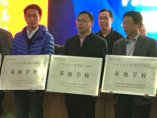 经学校申请以及省市专家审核,省教育学会物理教学专业委员会及省物理学会中学工作委员会确认我校为高中物理教学研究基地学校。成立基地学校,目的在于深度推进高中物理课程基地内涵建设,进一步深入研究物理校本课程体系的开发与建设、课内外多样化物理实验的有效开设与实践、物理课堂教学范式创新的探索与转型、物理教与学评价体系的构建与实施等问题。省物理学会、省教研室共同组建了江苏省高中物理课程基地联盟,组织联盟学校共同申报了省教研室重大研究项目——江苏省高中物理课程基地内涵建设的实践研究课题。