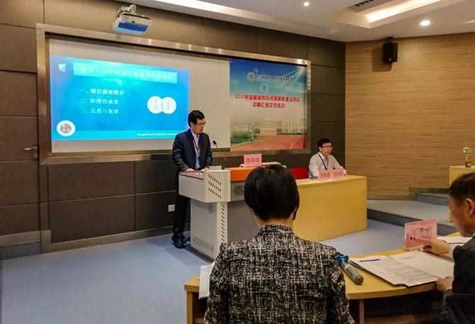 江苏省特级教师张淳老师作为基地负责人代表,向专家组汇报了我校基地建设进展情况和取得的阶段性成果。目前,我校基地建设的项目招投标、场地选择、项目设计等工作都已经完成,相关场所已经开始建设。在项目推进过程中,我们坚持硬件软件同步并进的原则,研发了部分“高中•大学衔接”校本课程教材,并且因地制宜,充分利用学校的备用教室、涵礼堂、图书馆等地方作为临时基地活动室,保证基地相关课程的实施。学校聘请南师大、南通大学等高校专家指导基地建设,在理论层面、操作层面和学科层取得了一些成果。学校已经完成部分课程整合与研发,初步建构了“衔接课程”教学模型,部分课程已经在高一、高二年级实施。