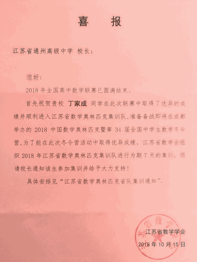 通过数学竞赛教练团队的不懈努力,每年在全国高中数学联赛(江苏赛区)中,我们都有不俗的表现。2018年,学校共有21名学生获联赛“江苏省一等奖”,2位学生获“赛区一等奖(国一)”,其中丁家成同学入选“数学竞赛江苏省代表队”。