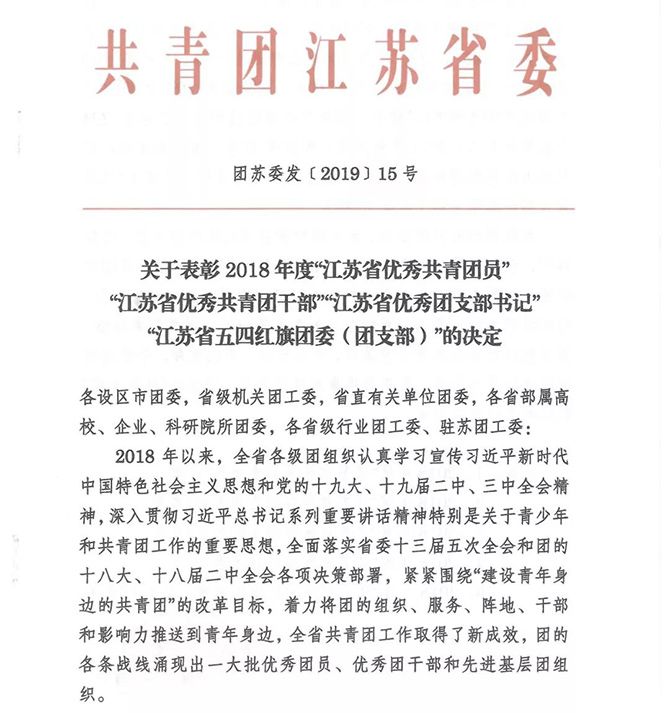 近日,共青团江苏省委传来喜讯,我校团委荣获“2018年度江苏省五四红旗团委”荣誉称号。“江苏省五四红旗团委”是团省委授予基层团委工作的最高荣誉。