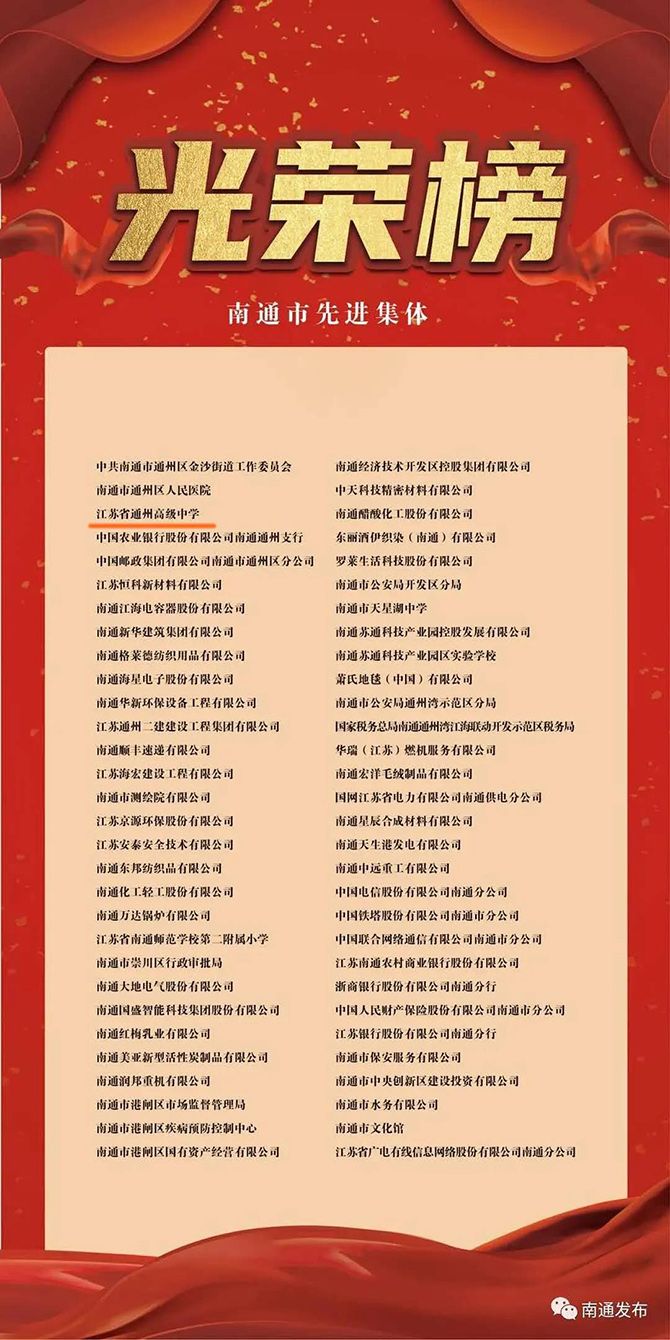 近日,南通市召开了2020年先进集体、劳动模范和先进工作者表彰大会,对近年来全市各条战线涌现出的先进集体和先进个人进行表彰,我校被表彰为2020年南通市先进集体。