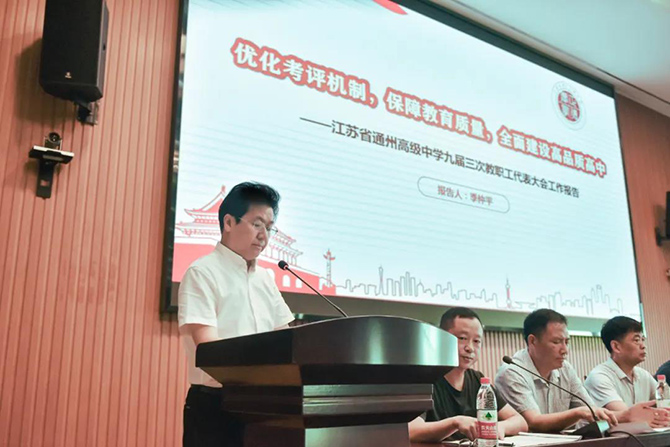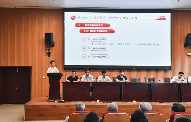 季仲平校长向全体教职工作学校年度工作报告,并结合本次议题明确了学校发展思路。一是改革绩效,科学考评,激发内驱力。其中,深入解读了修订绩效考核方案的基本原则。二是优化管理,追求效益,保障高质量。他指出,学校教育质量必须要以优异的教学质量为支撑,其中高考是关键,大张旗鼓抓高三,理直气壮抓高考,是任何一个高中学校的责任行为。三是保优补缺,全面提升,瞄准高品质。季校长提出“立德树人,向德育要质量”“发展教师,向师资要潜力”“完善课程,向改革要效益”三方面要求,鼓励全体教职工为学校未来出谋划策,为建设“高品质示范高中”努力奋斗。
