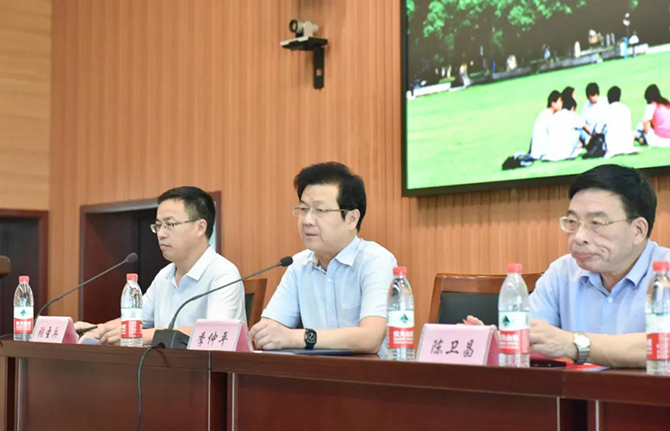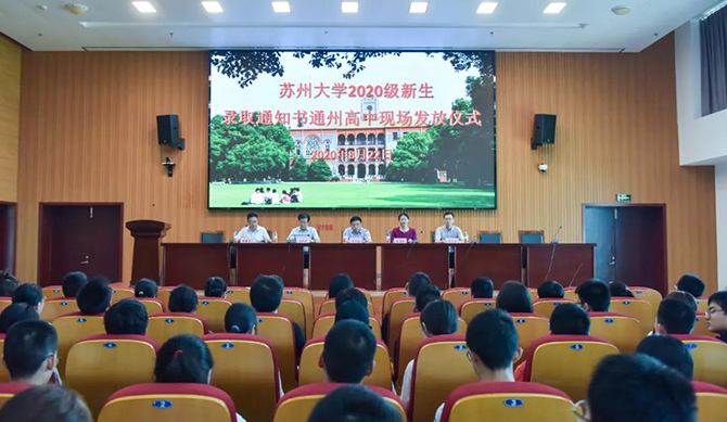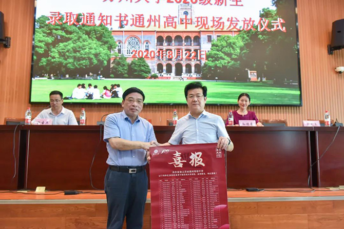 8月22日下午,苏州大学党委委员、副校长陈卫昌等领导来我校举行2020级新生录取通知书颁发仪式。季仲平校长、校长办公室何忠锋主任以及部分师生代表参加了活动,张圣兵副校长主持了仪式。