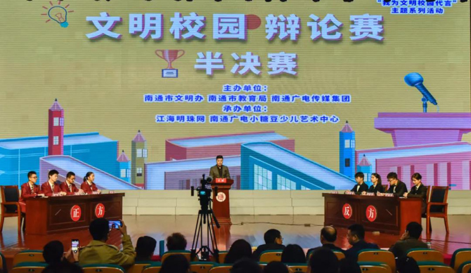 此次辩论赛为“我为文明校园代言”系列活动之一,由南通市文明办、南通市教育局和南通广电传媒集团联合主办,旨在展现当代学生精神面貌,推动文明校园创建工作再上台阶。辩论赛分为高校和中学两组,中学组由来自市直和各县区学校的16支代表队参赛。