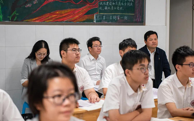 听课结束后,季仲平校长带领专家组参观了校园,介绍学校基本情况,就校园文化布局、物态文化立意向专家们作了简要阐述。专家组先后深入英语课程基地、心理健康教育课程基地、校史馆等场所了解评估。在英语课程基地,专家们对“高中大学衔接”的课程方向表示赞赏,认为这是“跨学段提升素养、多平台锻炼能力”的育人亮点。在心理健康教育课程基地,专家组翻阅了心理教育台账,了解相关器材的使用情况,肯定了学校心理健康教育取得的突出成绩。